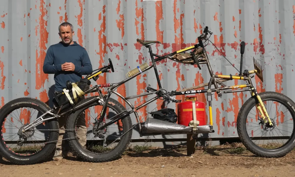 The features on this custom build are rather extensive, but the star of the show is the trailing link two wheel drive rear end. The third wheel was thrown on last minute with a random shock providing some measure of compliance to the rather unwieldy system. But while adding unnecessary complexity, the third wheel does offer the benefit of bringing along a number of spare parts on the last bikepacking trip of a lifetime. Moreover, it can be easily removed to get something resembling bicycle.