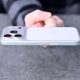 Hand holding a silver smartphone horizontally above a gray surface, showing triple rear cameras and buttons along the side, with a blurred person wearing dark clothing in the background