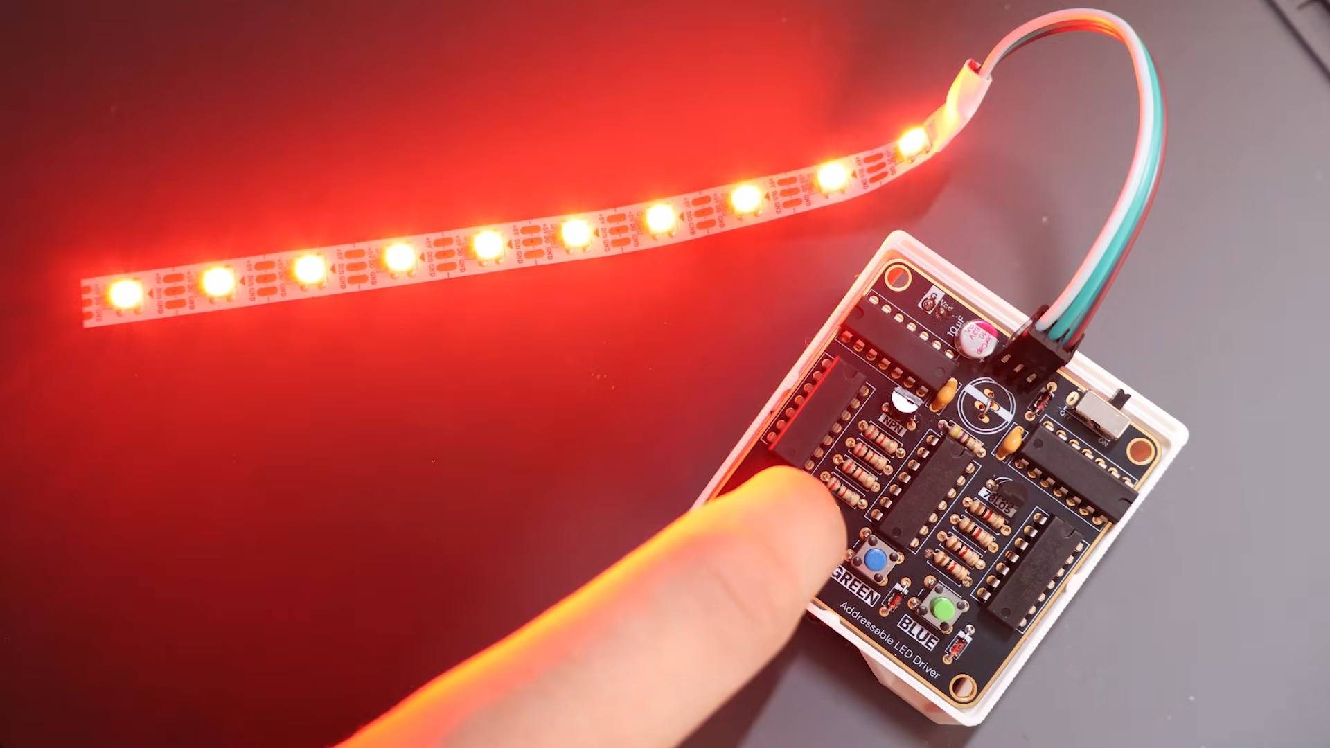 The project consists of a small board full of old-school ICs that can be used to drive WS2812Bs in a simplistic manner. A 74HC14 Schmitt trigger oscillator provides the necessary beat for this tune, generating an 800 kHz clock to keep everything in time and provide the longer pulse trains that represent logic one to a WS2812B. A phase-shifted AND gate generates the shorter pulses necessary to indicate logic zero. Meanwhile, a binary counter cycles through 24 bits (8 per R, G, and B) to handle color. Pressing each one of the three pushbuttons allows each color channel to be activated or deactivated as desired. It can make the strip red, green, or blue, or combine the channels if you press multiple buttons at once. That’s all the control you get—it would take a bit more logic to enable variable levels of each channel. Certainly within the realms of possibility, though.