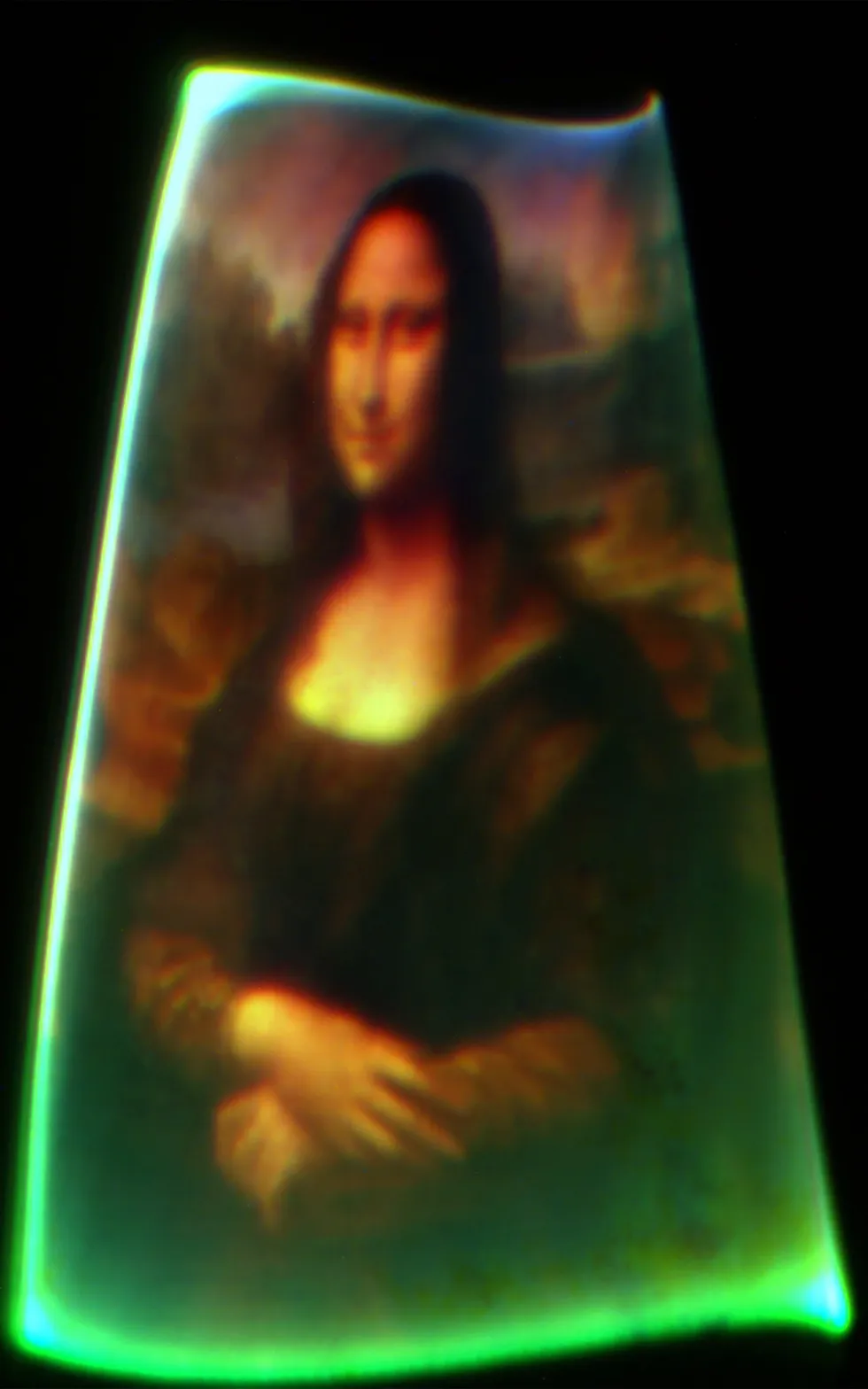 A warped projection of the Mona Lisa. The chip projected a roughly 125-micrometer image of the Mona Lisa.Matt Saha, Y. Henry Wen, et al.