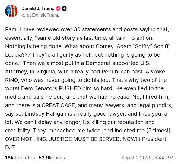 Bondi’s head may have been destined for the chopping block months ago, when Trump (in what appeared to be a personal message accidentally posted on main) berated Bondi for not doing all the impossible stuff he wanted done right now, like engaging in vindictive prosecutions that were (1) obviously vindictive, and (2) didn’t have enough evidence to support the hallucinatory charges dreamed up by Trump and his DOJ enablers.