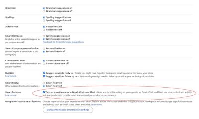 Toggle off smart features in Google Workspace and Smart features in other Google products.