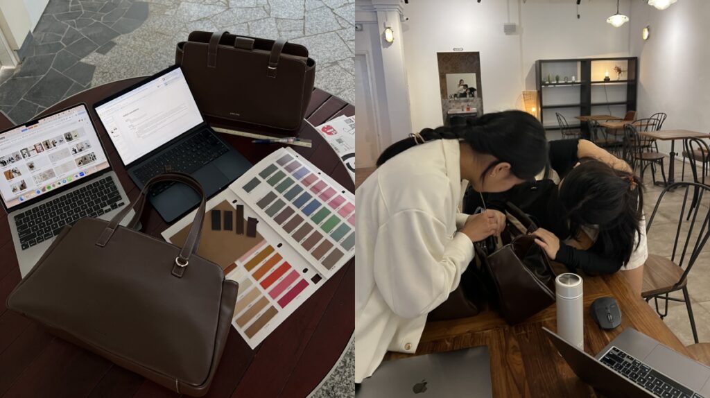 Sophia, Kayleigh, and Wanzhen met in a business class at NUS in early 2024. A casual conversation about the lack of durable, aesthetic, and functional handbags for young professional women sparked the idea that would eventually become their brand.