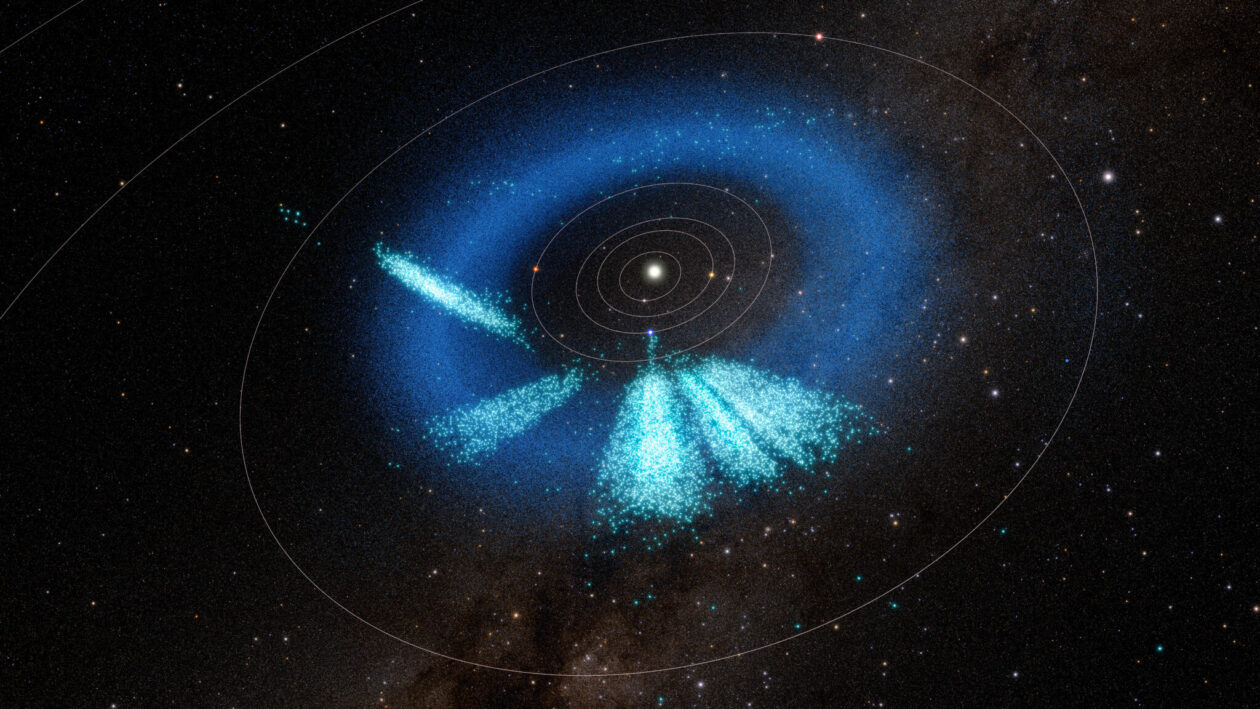 The specks of light teal shown in this rendering of the wider solar system represent the roughly 380 trans-Neptunian objects discovered using observations taken during Rubin’s early optimization surveys last summer. i(Photo: NSF–DOE Vera C. Rubin Observatory / NOIRLab / SLAC / AURA / R. Proctor. Star map: NASA / GSFC Scientific Visualization Studio. Gaia DR2: ESA/Gaia/DPAC. Image Processing: M. Zamani / NSF NOIRLab)
