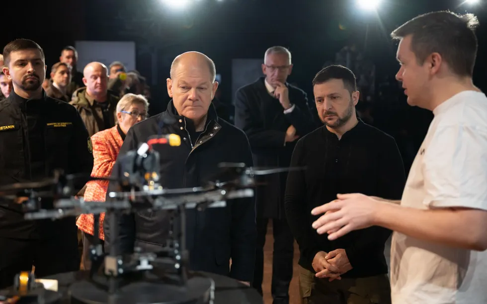 Compact black camera module with textured surface and orange ribbon cable on white background.The Ukrainian robotics company The Fourth Law produces an autonomy module [above] that uses optics and AI to guide a drone to its target. Yaroslav Azhnyuk [top, in light shirt], founder and CEO of The Fourth Law, describes a developmental drone with autonomous capabilities to Ukrainian President Volodymyr Zelenskyy and German Chancellor Olaf Scholz.Top: THE PRESIDENTIAL OFFICE OF UKRAINE; Bottom: THE FOURTH LAW