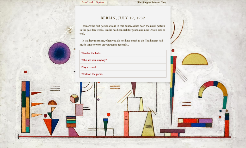 The story is far more than a cursory look at these events: it’s clearly rooted in robust historical knowledge about this critical time and place, with myriad details about the specifics of the political situation as well as an additional exploration of gender politics and transgenderism in the era. But what’s especially notable for this jam is the way it weaves in a wide variety of artistic and musical works from 1930, which form the backdrop of its setting and the game itself. Amidst the story unfolding (and careening towards its inevitable ending) the player wanders the halls of Braun’s house and chooses paintings to admire and music to listen to. These works (by Paul Klee, Wassily Kandinsky, Felix Mendelssohn, and more) become the wallpaper and soundtrack of the game.