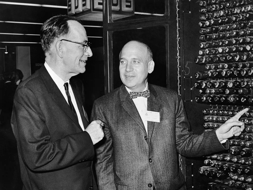Black and white 1960s image of two white men in suits looking at a wall of computer controls. Co-inventors John Mauchly [left] and J. Presper Eckert look at a portion of ENIAC on 25 November 1966. Hulton Archive/Getty Images