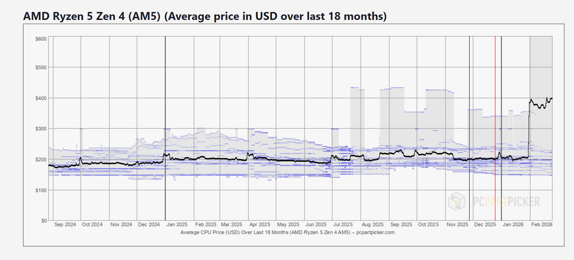 For more than a year, the selling price for models such as the Ryzen 5 7600X and 9600X sat between $170 and $220. That changed at the start of February 2026, when the average price suddenly shot up toward $400 and stayed there.