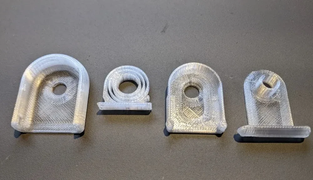 The model in question is a toggle, which is the commonly seen plastic or metal device that clamps down on e.g. rope or cord and requires you to push on it to have it release said clamping force. Normally these use a metal spring inside, but this version is fully 3D printable and thus forms a practical way to test this particular compliant mechanism with a variety of materials.