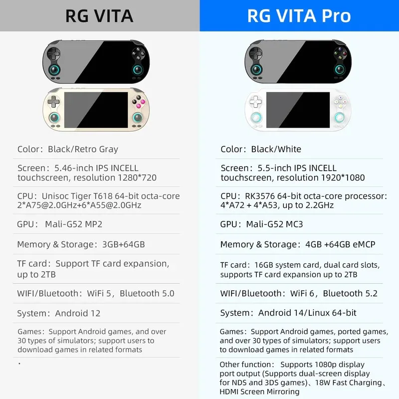 The standard Vita is a more affordable option that featurse a 5.46-inch IPS display with 720p resolution, powered by a Unisoc T618 chipset, paired with 3GB of RAM and 64GB of storage. On the other hand, the RG Vita Pro steps things with a slightly taller 1080p IPS display, a more capable Rockchip RK3576 processor, 4GB RAM, and the same expandable storage support via microSD.