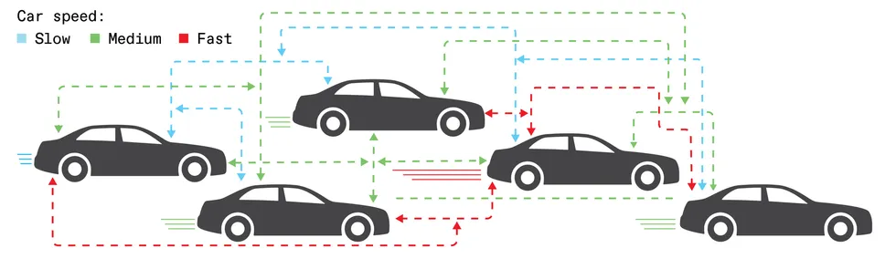 Diagram of cars at mixed speeds with complex dashed feedback loops between them