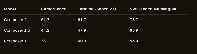 Cursor’s published results show a clear improvement over prior Composer models. The company lists Composer 2 at 61.3 on CursorBench, 61.7 on Terminal-Bench 2.0, and 73.7 on SWE-bench Multilingual.
