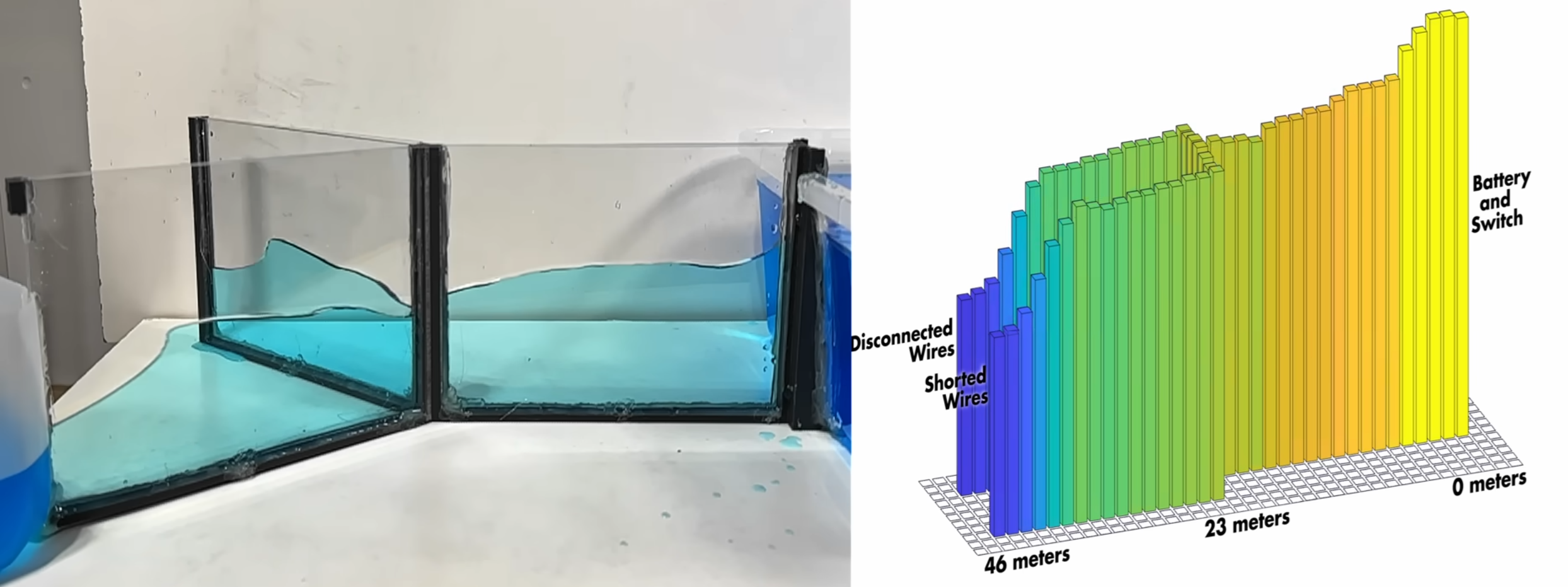 The experiment relies on a twisted-pair Y-harness, where one leg is left open and the other is terminated by a resistor. By stitching together oscilloscope traces captured at regular intervals along the wire, [Alpha Phoenix] constructs a visualization of the voltage pulse propagating. To make this intuitive, [Alpha Phoenix] built a water model of the same circuit with acrylic channels, and the visual result is almost identical to the electrical traces.
