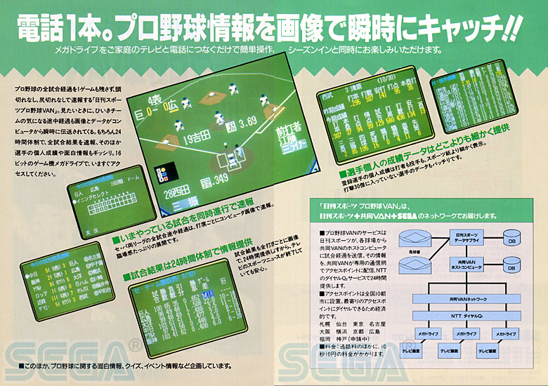 The system hit the market on November 3 1990, exclusively for the Japanese market, with Sega talking up a future launch in the US under the “Tele-Genesis” name. The initial Mega Net kit cost ¥12,800, which included the Mega Modem accessory—a simple 1,200 bps dial-up modem which plugged into the “EXT” DE-9 port on the back of the Model 1 Mega Drive. Access to Mega Net service came at a cost of ¥800 a month. Users got a copy of Nikkan Sports Pro Baseball VAN, which provided live updates and statistics on baseball matches when connected to the service.