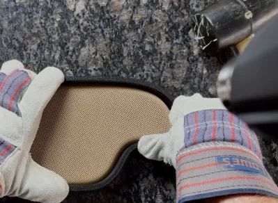 Making sure the heatgun is on ‘low’ and gloves are on while pushing on the mold. (Credit: Zion Brock)